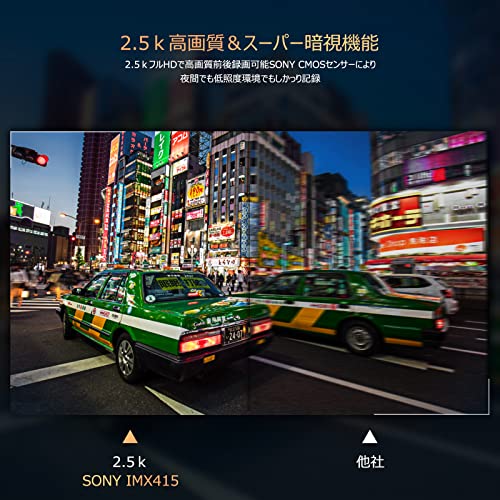 【SUPER NIGHT機能・Sonyセンサー搭載で同時録画上下/左右鏡像、同時設定可能】ドライブレコーダー業界先端のSonyIMX415センサーを採用し、2カメラ同時高画質録画可能フロントカメラフルHD2.5K+リアカメラフルHD1080Pを実現しました。STARVIS対応機らしい明るさで市街地や街灯が少ない場所でのヘッドライトのみでの走行時には通常のドライブレコーダーの明るさを大きく上回っています。様々な環境への対応を強化、雨/雪/霧などの天候もぼやけることなくくっきり映像できます!リアカメラの画面が設定メニューには上下反転/左右反転設定でき、モニターに表示された画面と実際の方向と全く同じであることを確保しながら、車内のリアガラス、車外のナンバープレートフレームの下、オフロード車のペダルなど、さらに設置場所を選択できます。